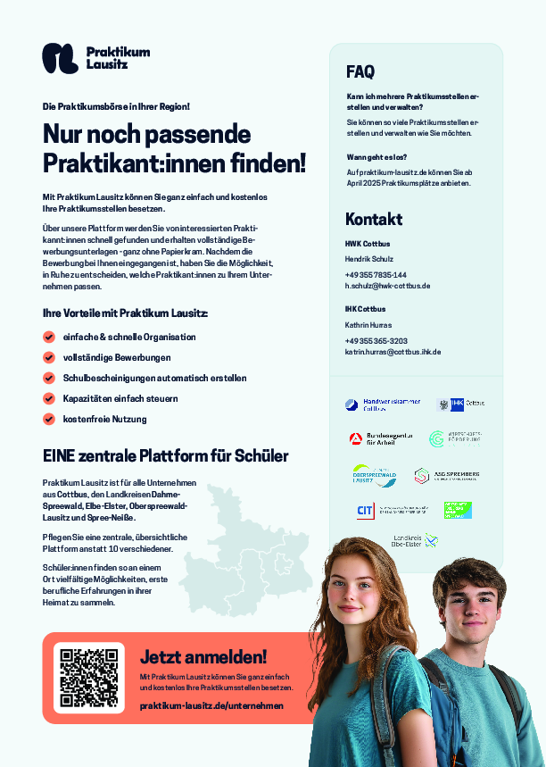 Mit Praktikum Lausitz können Sie ganz einfach und kostenlos Ihre Praktikumsstellen besetzen.