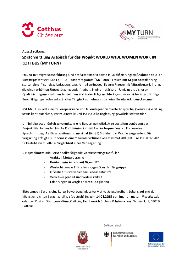 Ausschreibung: Sprachmittlung Arabisch für das Projekt WORLD WIDE WOMEN WORK IN COTTBUS (MY TURN)