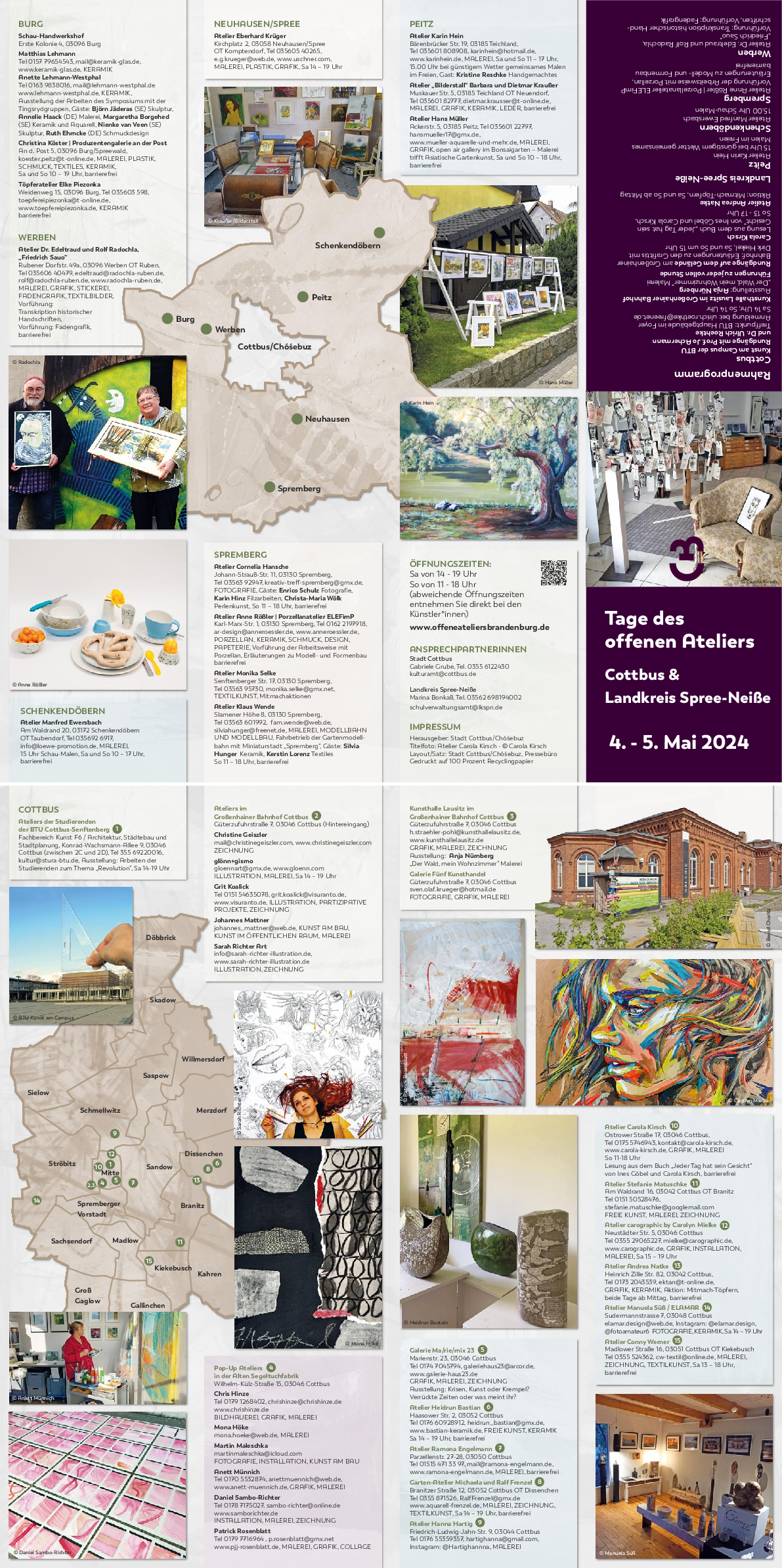 Programmhefte und Flyer mit allen Adressen und Detail-Informationen liegen an verschiedenen Stellen in der Stadt aus, u.a. im Cottbus-Service in der Stadthalle, in den Rathäusern und Verwaltungsstandorten sowie beim Citymanagement in der Sprem.