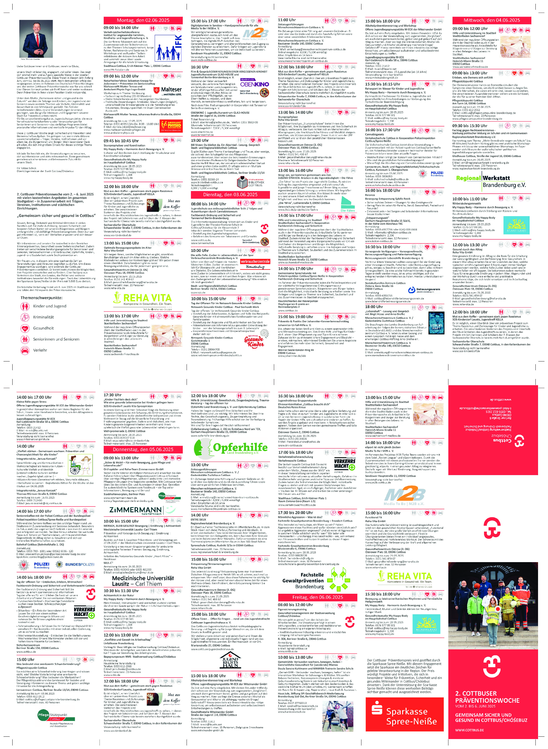 In der Stadt Cottbus/Chóśebuz findet vom 2. bis 6. Juni 2025 unter dem Motto „Gemeinsam sicher und gesund in Cottbus“ die 2. Cottbuser Präventionswoche statt. Nach dem großen Erfolg im vergangenen Jahr setzt die Stadt Cottbus/Chóśebuz damit ihr Engagement im Bereich Sicherheit, Gesundheit und gesellschaftlicher Zusammenhalt fort.