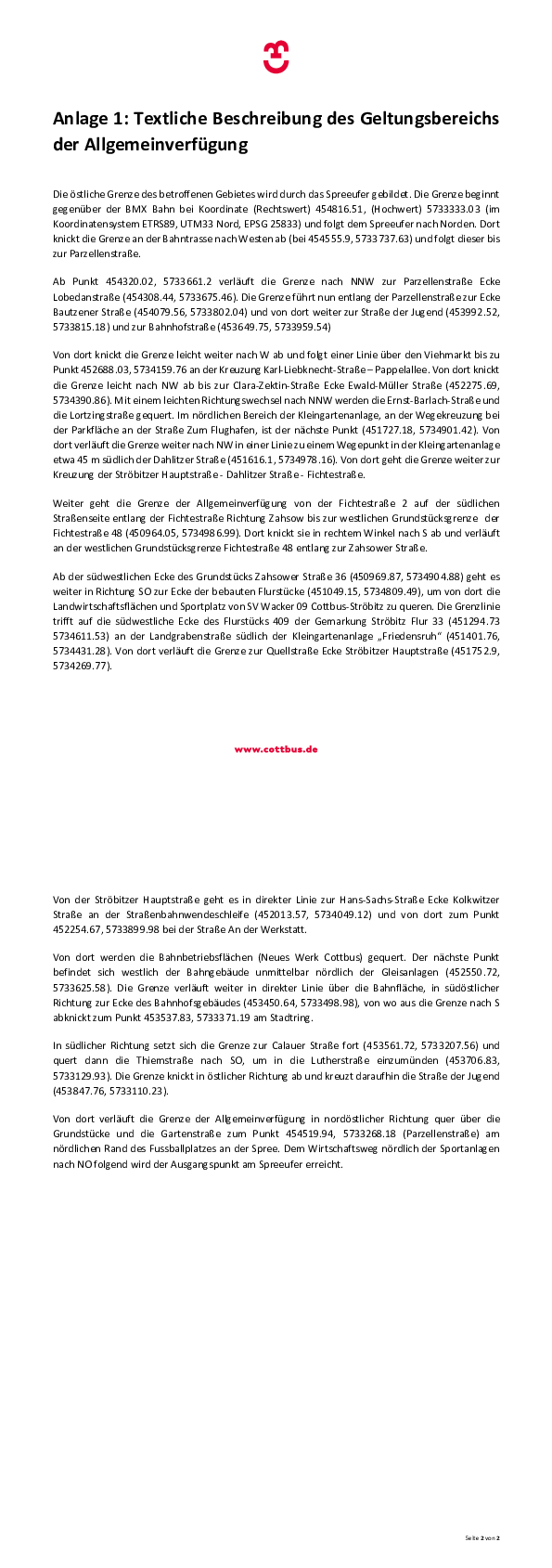 H2) Diese Allgemeinverfügung wird auch auf der Webseite der Stadt Cottbus/Chósebuz www.cottbus.de (> Ortsrecht) veröffentlicht. Sie kann auch im Fachbereich Umwelt und Natur der Stadtverwaltung Cottbus/Chóśebuz, Neumarkt 5, 03046 Cottbus nach Terminvereinbarung unter der Telefonnummer 0355 612 2881 oder per Email an umweltamt@cottbus.de eingesehen werden.
