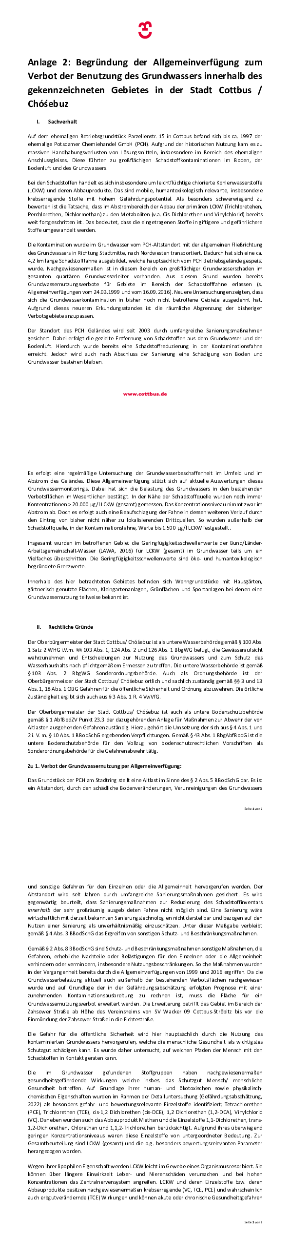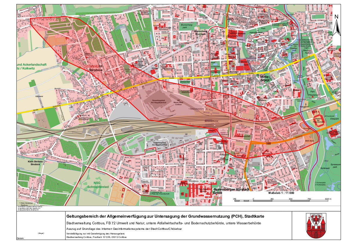Der Geltungsbereich des Grundwassernutzungsverbotes ist in Anlage 1 verbal beschrieben. Die Allgemeinverfügung gilt örtlich in den in Anlage 3 und 4 dargestellten Grenzen. Die Anlagen sind Bestandteil der Allgemeinverfügung und können auf den in den Hinweisen H1 und H2 genannten Internetseiten eingesehen werden. Der Geltungsbereich kann auch im Geoportal der Stadt Cottbus/Chóśebuz abgerufen werden unter: geoportal.cottbus.de (Auswahl: Geoportal starten > im Themenbaum anklicken: Umwelt und Natur > Wasser > Grundwassernutzungsverbot 2025).