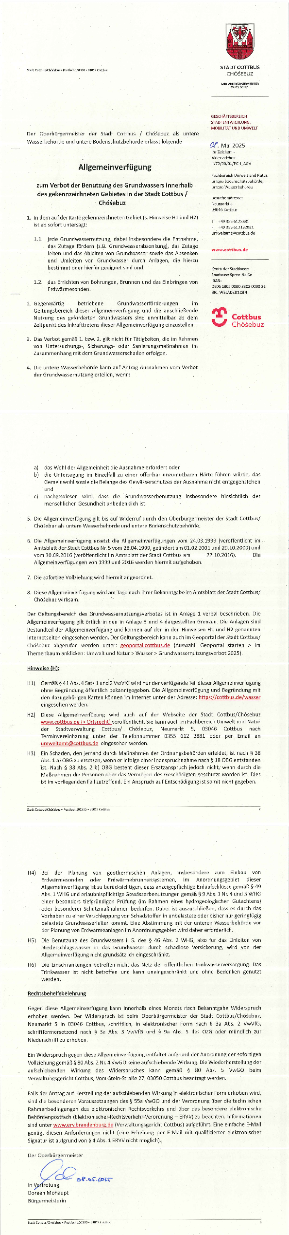 H1) Gemäß § 41 Abs. 4 Satz 1 und 2 VwVfG wird nur der verfügende Teil dieser Allgemeinverfügung ohne Begründung öffentlich bekanntgegeben. Die Allgemeinverfügung und Begründung mit den dazugehörigen Karten können im Internet unter der Adresse: https://joerg.neucottbus.de/wasser eingesehen werden.