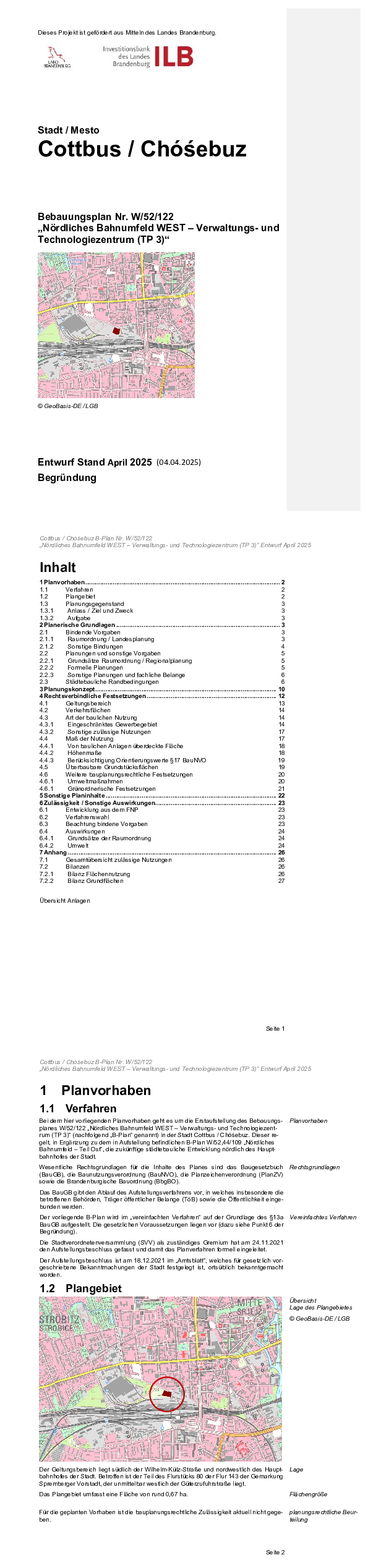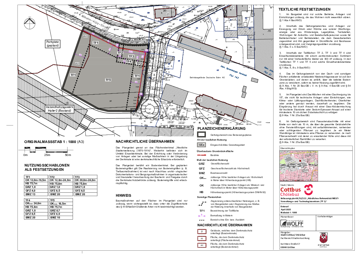 Die Stadtverordnetenversammlung der Stadt Cottbus/Chóśebuz hat in ihrer Sitzung am 28.05.2025 den Entwurf des Bebauungsplanes „Nördliches Bahnumfeld WEST – Verwaltungs- und Technologiezentrum (TP 3)“ einschließlich der zugehörigen Begründung in der Fassung vom April 2025 gebilligt und die Beteiligung der Öffentlichkeit gemäß § 3 Abs. 2 Baugesetzbuch (BauGB) beschlossen.