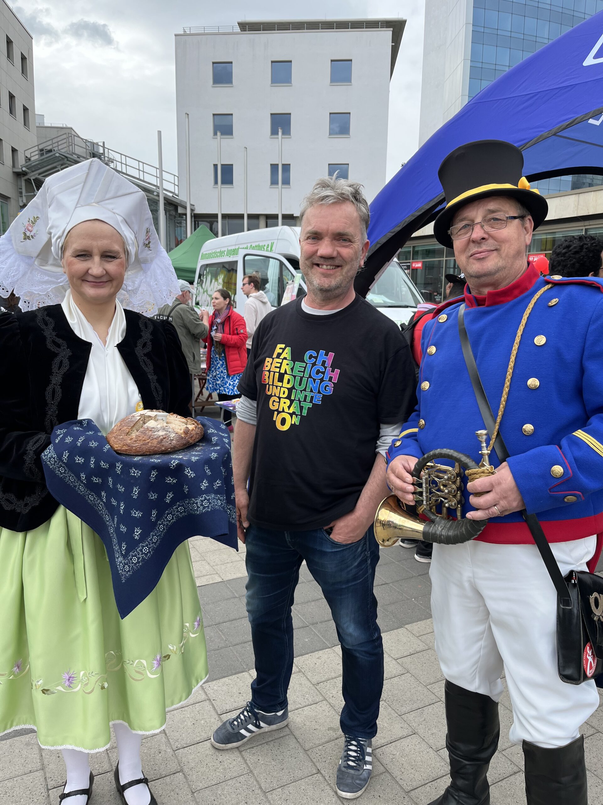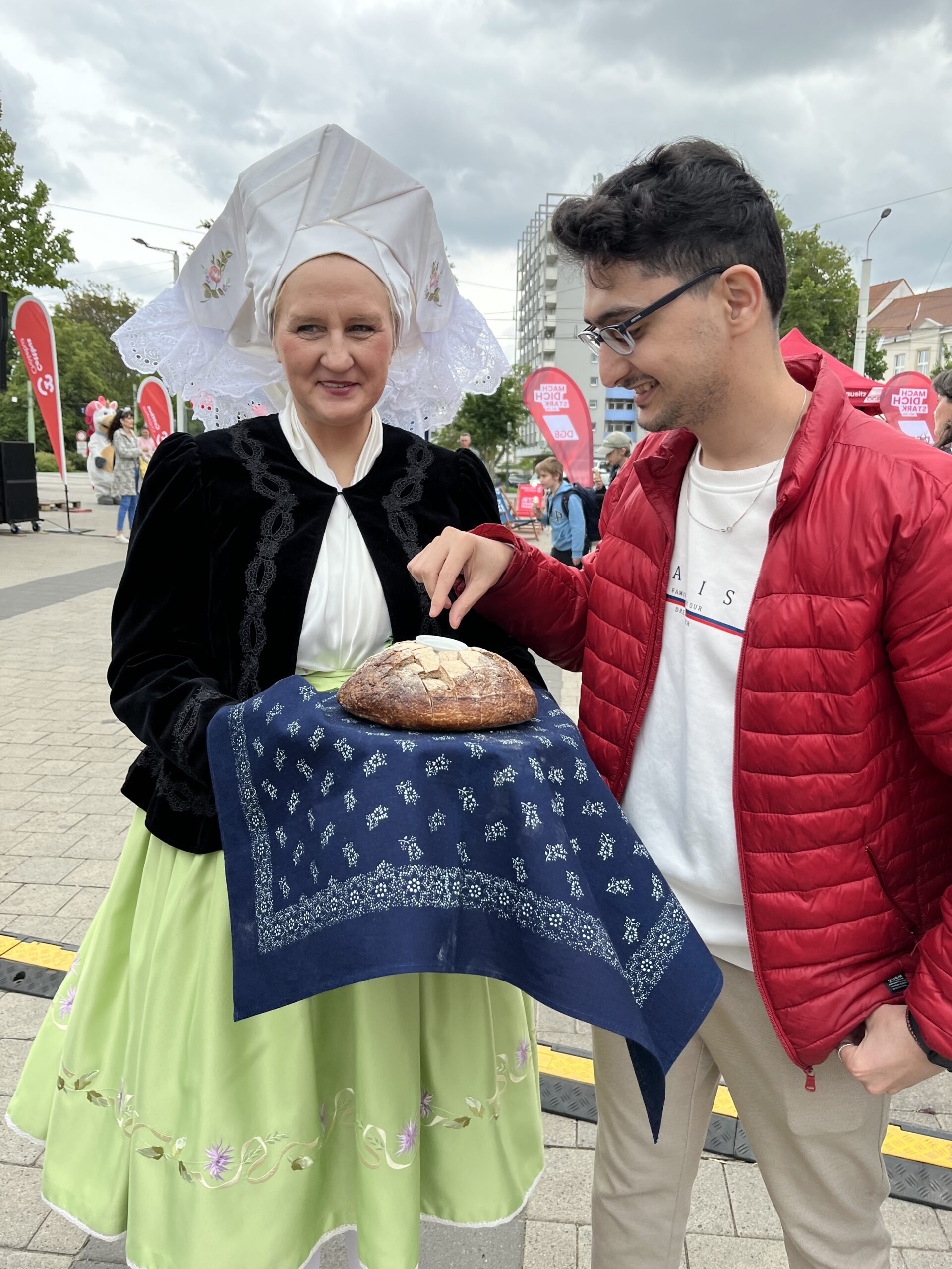 Am 22. Mai fand zum zweiten Mal das Willkommensfest „KLĔB A SOL – Brot und Salz“ statt – diesmal erstmals auf dem Stadthallenvorplatz. Neue Cottbuserinnen und Cottbuser, internationale Studierende und Azubis feierten gemeinsam mit Einheimischen ein buntes Fest der Begegnung.