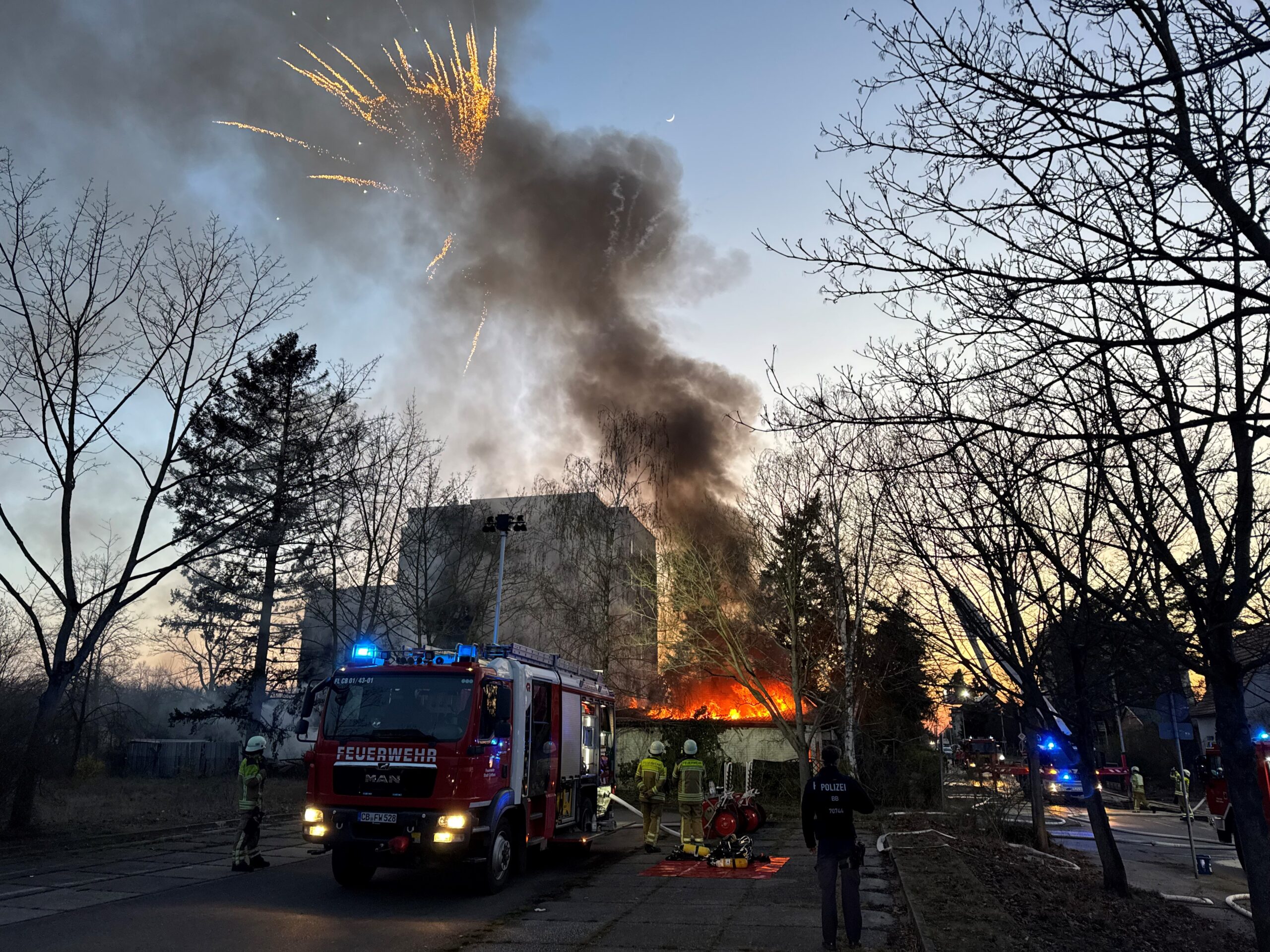 Im Einsatz waren am Abend 54 Feuerwehrleute von der Cottbuser Berufswehr sowie freiwillige Wehren aus dem Gerätehaus Süd, aus Branitz, aus Sachsendorf, aus Kahren und Sandow sowie Kräfte vom DRK und der SEG Versorgung.