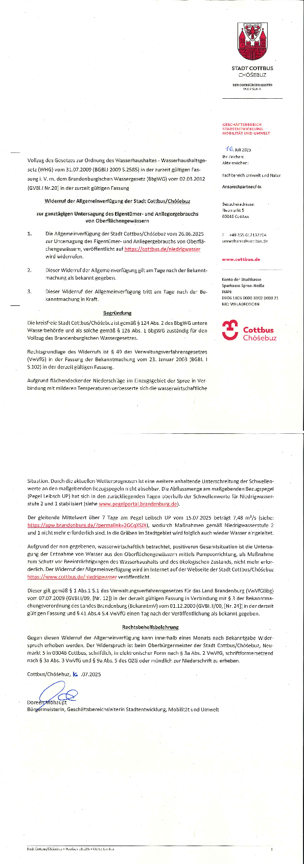 Die entsprechende Allgemeinverfügung vom 26.06.2025 ist widerrufen worden. Veröffentlicht ist der Widerruf auf www.cottbus.de/allgemeinverfuegungen am Donnerstag, 17.07.2025. Eine ergänzende Veröffentlichung erfolgt im nächsten turnusmäßigen Amtsblatt der Stadt Cottbus/Chóśebuz.