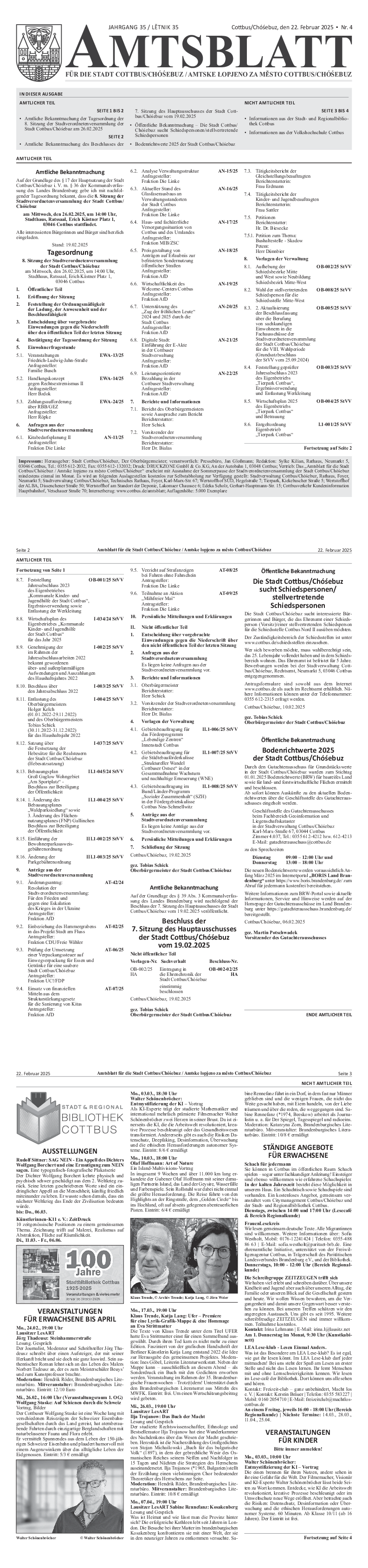 - Amtliche Bekanntmachung der Tagesordnung der 8. Sitzung der Stadtverordnetenversammlung der Stadt Cottbus/Chóśebuz am 26.02.2025