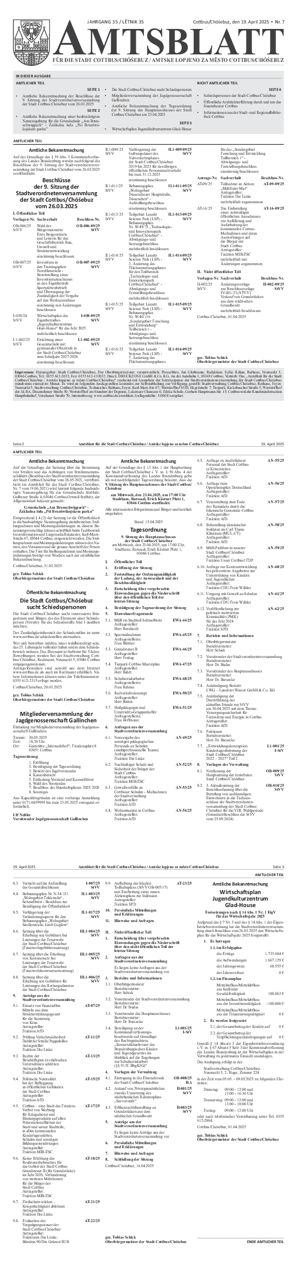 • Amtliche Bekanntmachung der Beschlüsse der 9. Sitzung der Stadtverordnetenversammlung der Stadt Cottbus/Chóśebuz vom 26.03.2025