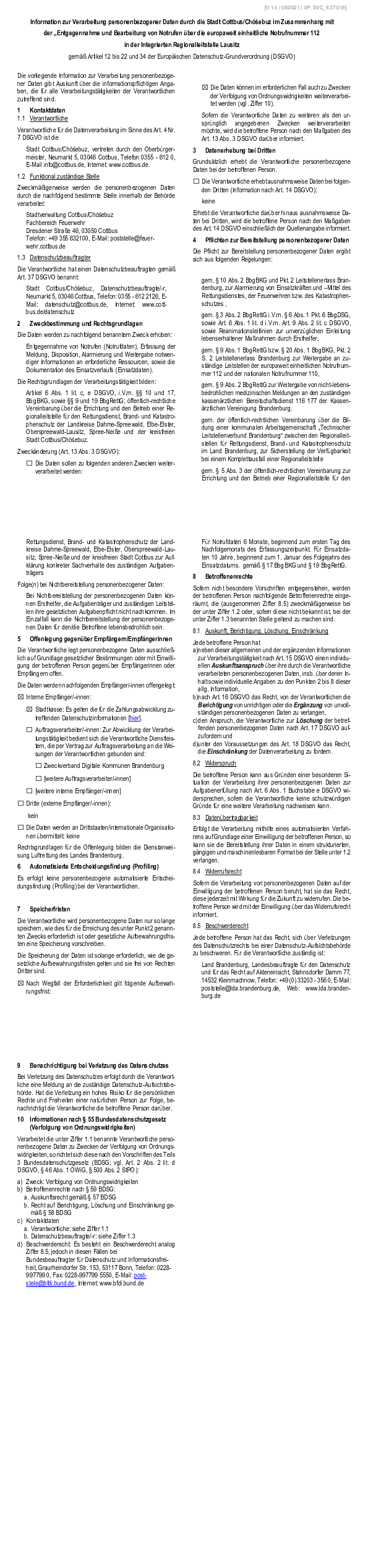 Information zur Verarbeitung personenbezogener Daten durch die Stadt Cottbus/Chóśebuz im Zusammenhang mit der