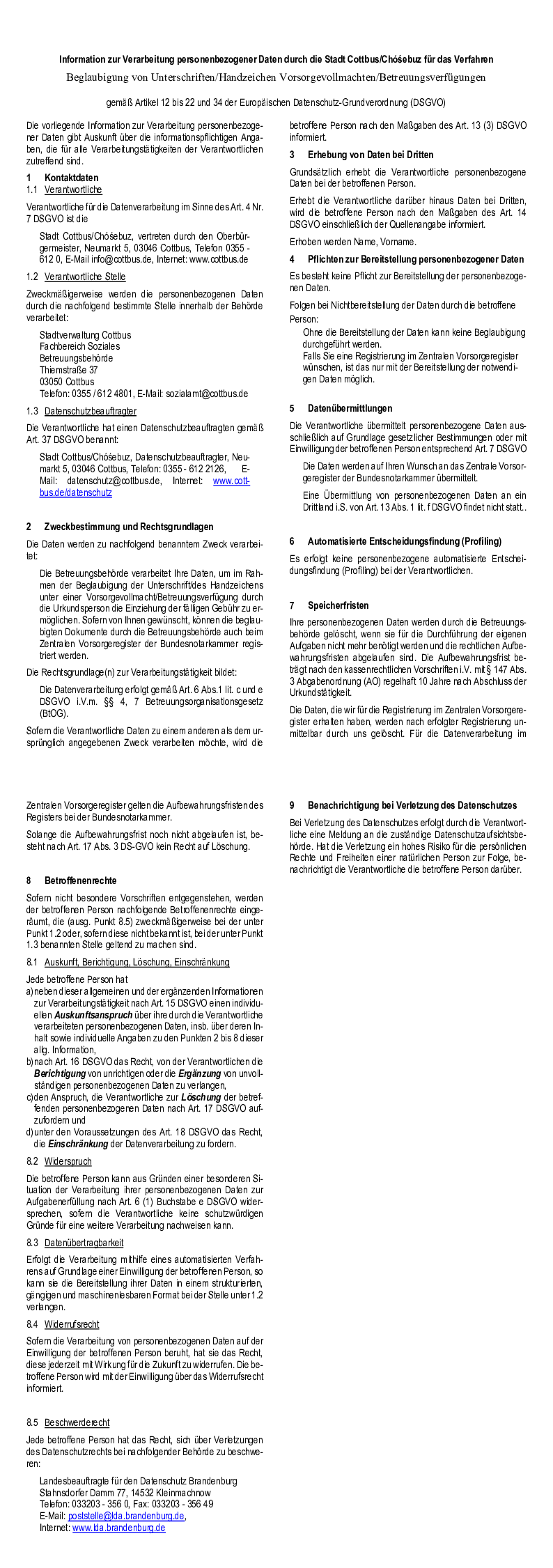 Information zur Verarbeitung personenbezogener Daten durch die Stadt Cottbus/Chóśebuz für das Verfahren