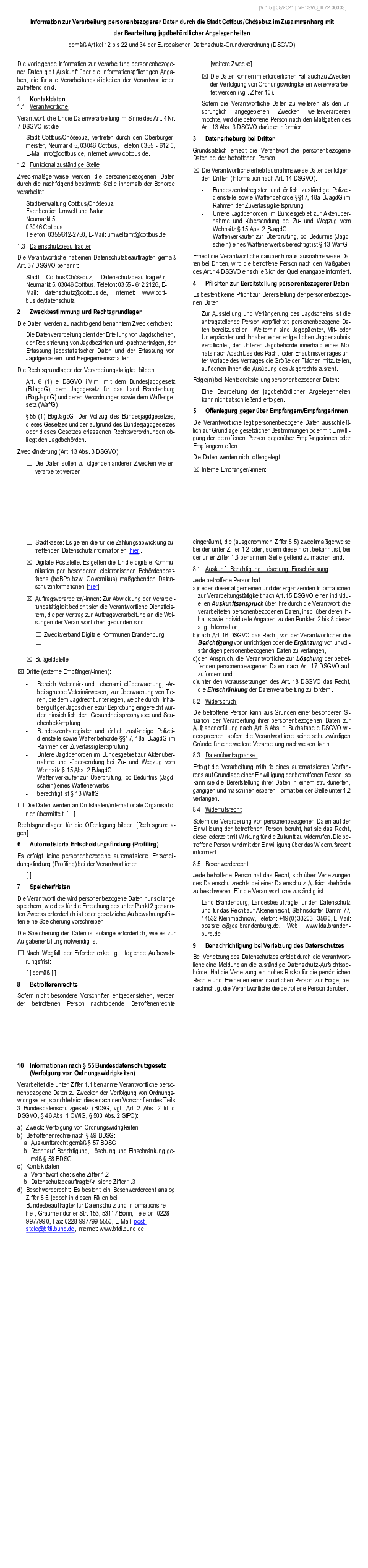 Information zur Verarbeitung personenbezogener Daten durch die Stadt Cottbus/Chóśebuz im Zusammenhang mit der