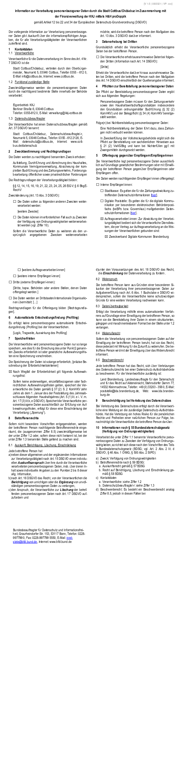 Information zur Verarbeitung personenbezogener Daten durch die Stadt Cottbus/Chóśebuz im Zusammenhang mit der Finanzverwaltung der KKJ mittels H & H proDoppik