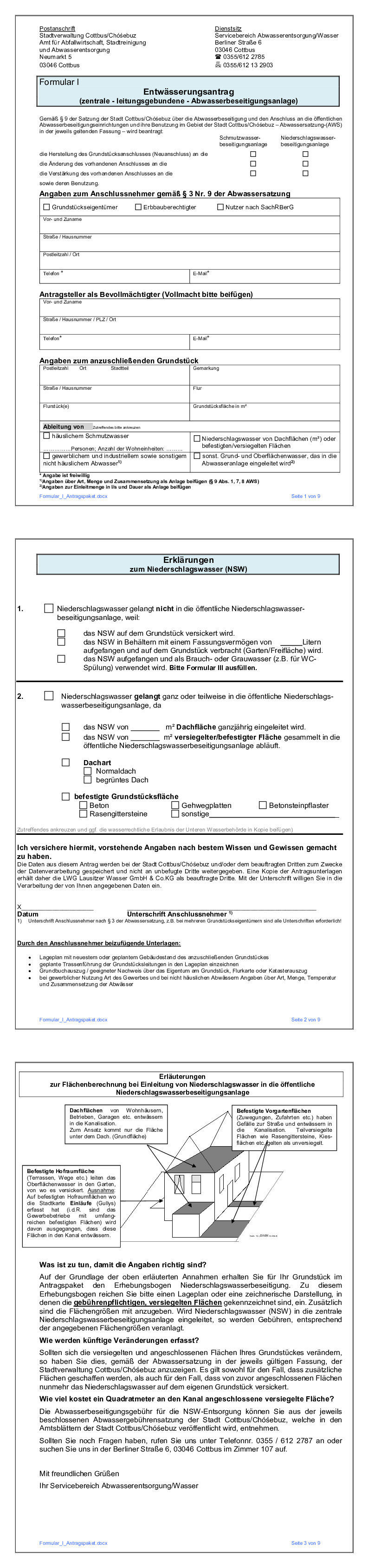 Die Herstellung oder wesentliche Änderung des Anschlusses an die öffentliche zentrale (leitungsgebundenen) Schmutzwasserbeseitigungsanlage oder an die Niederschlagswasserbeseitigungsanlage und deren Benutzung bedürfen der schriftlichen Antragstellung des Anschlussnehmers ( Entwässerungsantrag nach § 9 AWS – Formular I ) und der schriftlichen Genehmigung durch die Stadt.