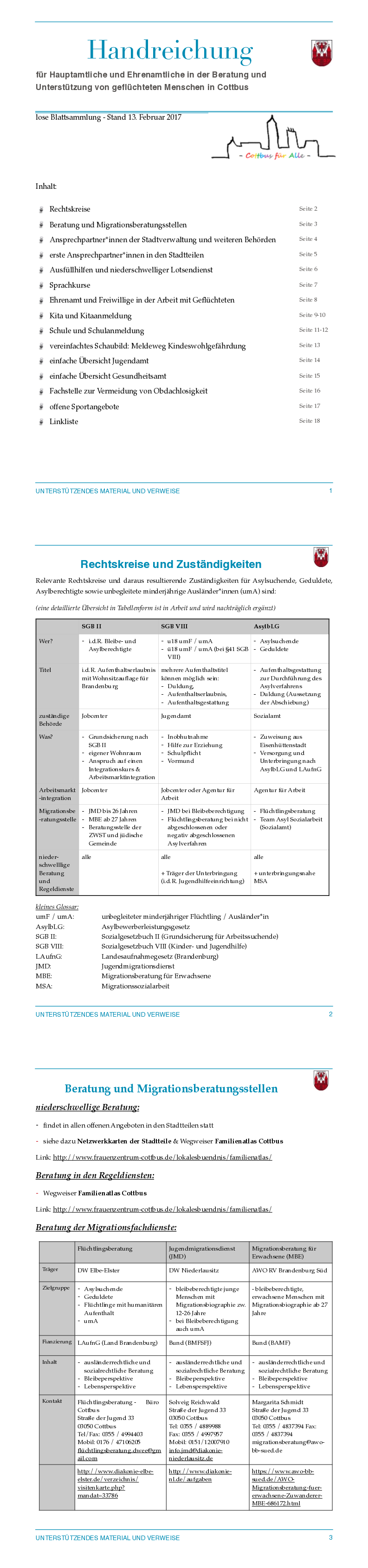Rechtskreise, Beratung und Migrationsberatungsstellen, Ansprechpartner*innen, Ausfüllhilfen und niederschwelliger Lotsendienst, Sprachkurse, Ehrenamt und Freiwillige in der Arbeit mit Geflüchteten, Kita und Kitaanmeldung, Schule und Schulanmeldung, Meldeweg Kindeswohlgefährdung, Jugendamt, Gesundheitsamt, Fachstelle zur Vermeidung von Obdachlosigkeit, offene Sportangebote, Linkliste