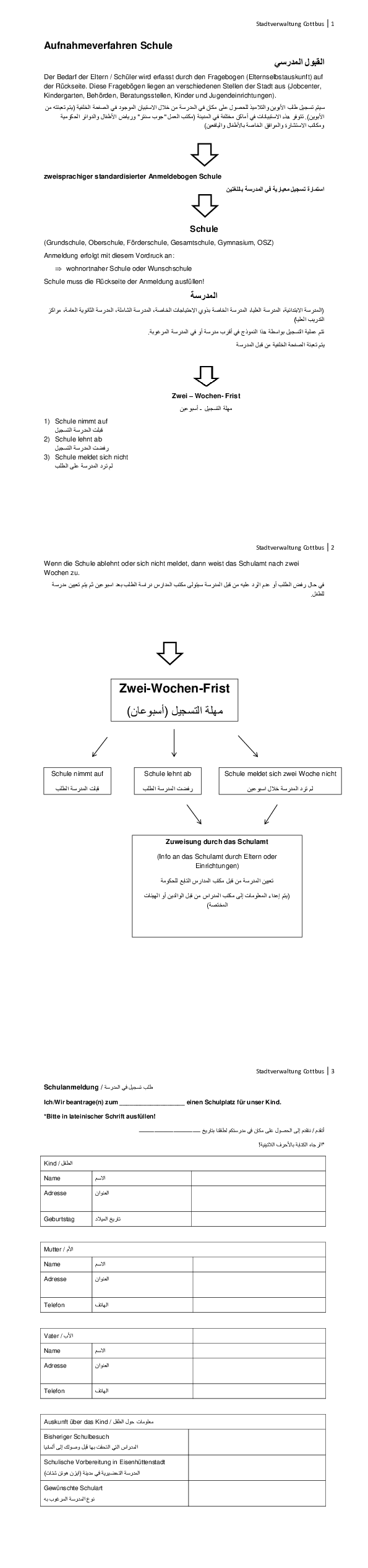 Der Bedarf der Eltern/Schüler wird durch den hier zur Verfügung gestellten Fragebogen (Elternselbstauskunft) erfasst und die Schulaufnahme für Geflüchtete beantragt.