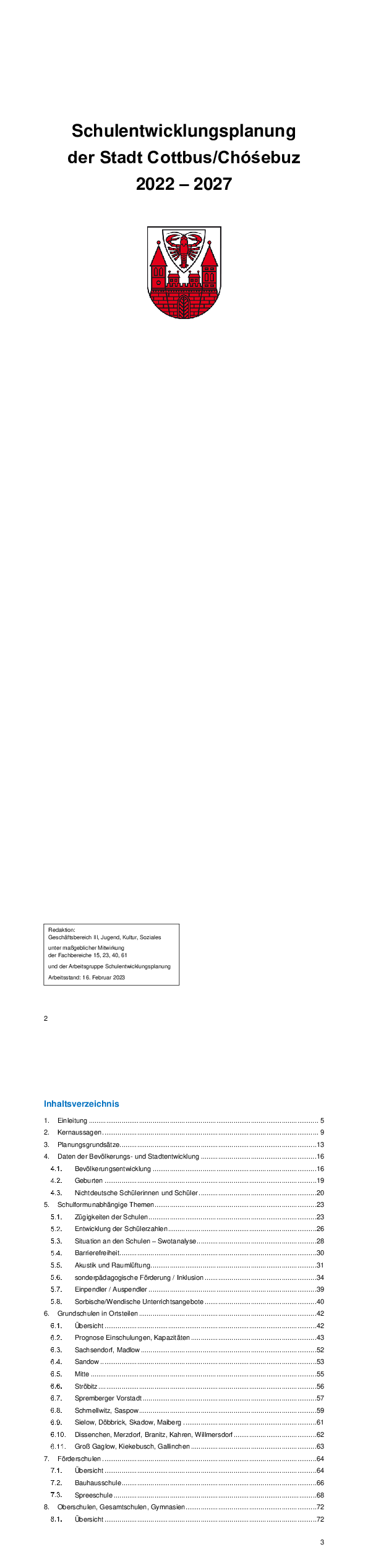 Teilfortschreibung Schulentwicklungsplan der Stadt Cottbus für weiterführende Schulen