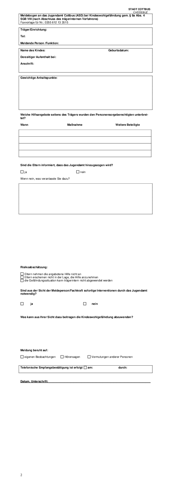 Das vorliegende Kinderschutzkonzept macht deutlich, dass sich Kinderschutz nicht nur auf die Fachkräfte der Kinder- und Jugendhilfe beschränkt. Neben der Vereinbarung zu verbindlichen Standards in der Umsetzung des § 8a SGB VIII- Schutzauftrag bei Kindeswohlgefährdung – ist es gelungen, ein tragfähiges Netzwerk Kinderschutz Cottbus aufzubauen (siehe Konzept S. 8) und auf dessen Grundlage gemeinsame Arbeitsstrukturen sowie Leitfäden, Dokumentationen und Vereinbarungen mit den Kooperationspartnern aus Bildung, Medizin, Polizei und Justiz zu erarbeitet werden konnten.