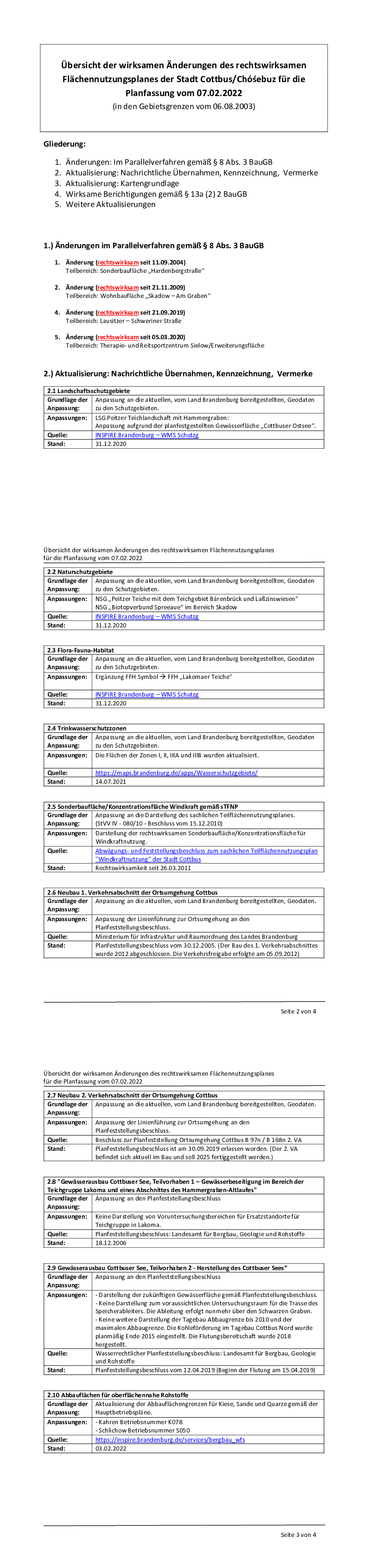 Alle bislang wirksamen Änderungen des Flächennutzungsplanes wurden jeweils für sich beschlossen, genehmigt und bekanntgemacht und erfolgten im Parallelverfahren zu Bebauungsplänen gemäß § 8 (3) Baugesetzbuch. Eine Überführung der wirksamen Änderungen in die FNP-Planzeichnung erfolgte jedoch zuletzt am 11.09.2004 im Zuge der 1. Änderung. Mit der Planfassung 2022 wurden alle bislang wirksamen Änderungen, die die Plandarstellung des Flächennutzungsplanes betreffen, auf Blatt 1 des FNP dargestellt. Darüber hinaus wurden weitere Aktualisierungen, die sich seit der Rechtswirksamkeit vom 06.08.2003 ergeben haben, ebenfalls dargestellt. Aktualisierungen betreffen beispielsweise die Darstellungen von Natur- und Landschaftsschutzgebieten, Trinkwasserschutzgebieten und auch übergeordnete Planfeststellungsbeschlüsse z.B. zur Ortsumfahrung Cottbus oder zur Herstellung des Gewässers „Cottbuser Ostsee“.
