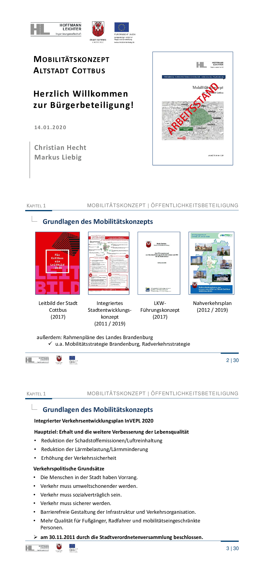 Der aktuelle Stand wurde am 14.01.2020 auf zwei öffentlichen Veranstaltungen durch die Stadtverwaltung Cottbus/Chóśebuz und dem bearbeitenden Büro Hoffmann-Leichter Ingenieurgesellschaft mbH vorgestellt .
