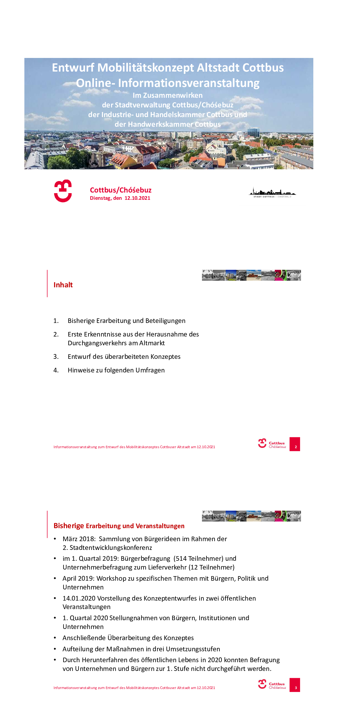 Zunächst fand ein gemeinsam von der IHK Cottbus und der Stadtverwaltung Cottbus/Chóśebuz organisierter Termin für Händler, Gastronomen und für weitere Unternehmer der Altstadt statt. Es folgte eine Bürgerversammlung im Saal des Stadthauses am Erich Kästner Platz 1.