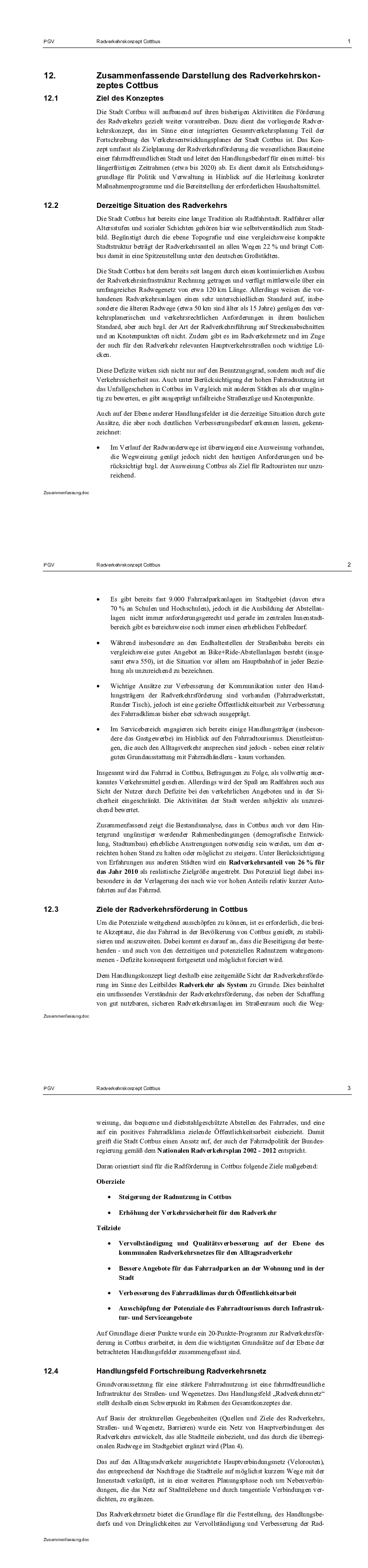 Das Konzept umfasst als Zielplanung der Radverkehrsförderung die wesentlichen Bausteine einer fahrradfreundlichen Stadt und leitet den Handlungsbedarf für einen mittel- bis längerfristigen Zeitrahmen (etwa bis 2020) ab. Es dient damit als Entscheidungsgrundlage für Politik und Verwaltung in Hinblick auf die Herleitung konkreter Maßnahmenprogramme und die Bereitstellung der erforderlichen Haushaltsmittel. In der Anfangsphase des Projektes diente die ganztägige Fahrradwerkstatt unter Beteiligung eines breiten Spektrums von Akteuren der Sammlung von Kritikpunkten und Forderungen zur Radverkehrssituation in Cottbus und zur Förderung eines verwaltungs-übergreifenden Konsenses. Diesem Ziel diente auch die Etablierung des Runden Tisches Radverkehr, dessen Teilnehmern Zwischen- und Endergebnisse aus dem Radverkehrskonzept erläutert und zur Diskussion gestellt wurden.