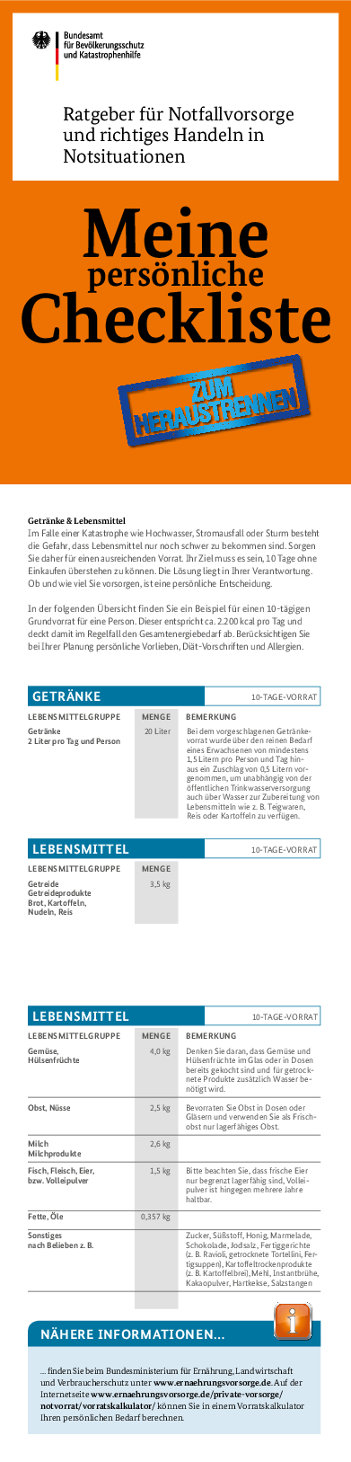 Das staatliche Hilfeleistungssystem greift in solchen Situationen und bietet Unterstützung. Aber auch die beste Hilfe ist nicht immer sofort zur Stelle. Bei großflächigen Schadenslagen können die Rettungskräfte nicht überall gleichzeitig sein. Wer vorbereitet ist, kann sich selbst, Angehörigen und Nachbarn helfen, bis die staatliche Hilfe eintrifft und Schäden mit Schutzmaßnahmen reduzieren. Helfen Sie mit, Notsituationen gemeinschaftlich zu bewältigen, und sorgen Sie vor! Hier finden Sie Anregungen und Empfehlungen für die Planung Ihrer persönlichen Notfallvorsorge.