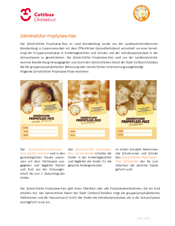 Der Zahnärztliche Prophylaxe-Pass wird von der Landeszahnärztekammer Brandenburg herausgegeben und durch den Zahnärztlichen Dienst der Stadt Cottbus/Chóśebuz bei der gruppenprophylaktischen Betreuung oder zahnärztlichen Untersuchung ausgehändigt.