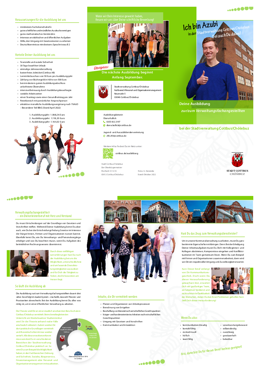Die theoretische Ausbildung erfolgt für diesen Beruf am OSZ II SPN ( www.osz2spn.de ) in Cottbus und wird weiterhin durch dienstbegleitenden Unterricht durch das Niederlausitzer Studieninstitut für kommunale Verwaltung ergänzt. Die Ausbildung dauert 3 Jahre und beginnt am 1. September.